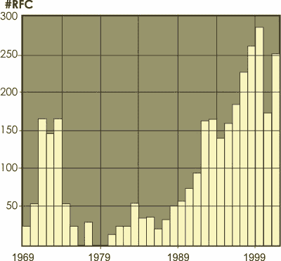 Из этого распределения видно, что к 1979 году окончательно сформировался стек базовых протоколов и начался экстенсивный рост сети Интернет. По мере выявления недостатков протоколов и новых потребностей после 1989 года началась активная разработка новых направлений и приложений в Интернет.