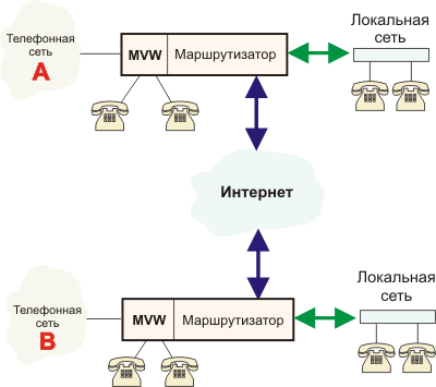 На рисунке MVW-модуль (Multiflex Voice/WAN), включаемый в маршрутизатор, например, CISCO-3662, служит для связи с общедоступной телефонной сетью. Если сеть “А” размещена в Рио-де-Жанейро, а “В” в Москве, то любой клиент нижней сети сможет разговаривать с клиентом в Рио “бесплатно”, а с клиентами телефонных сетей “А” и “B” по локальным тарифам. В левой части рисунка показаны телефонные аппараты, которые подключаются непосредственно к сегменту локальной сети. Такие приборы уже поступили в продажу.