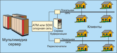 Данная схема, реализованная в США и Канаде несколько лет назад, позволяет клиентам индивидуально заказывать программу телевидения на неделю вперед. Помимо этого в режиме меню можно получить данные о погоде, состоянии дорог, заказать билеты в театр или на самолет, а также вызвать на экран нужную статью какой-то газеты. Заказанные фильмы копятся в сервере буферизации и в требуемое время транслируются для клиента-заказчика. Существующая инфраструктура кабельного телевидения в США вполне пригодна для решения таких задач. В реальном масштабе времени здесь передаются только новости и спортивные соревнования.