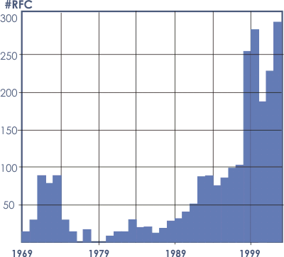 Рис. 1. Число выпущенных документов RFC по годам.