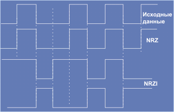| CMI | coded mark inversion | Двухуровневый двоичный код (класса 1B2B) без возвращения к нулю. Используется инверсия полярности для каждой логической 1 (единице ставится в соответствие 11 или 00), а для каждого логического нуля вводится смена полярности в середине интервала. |