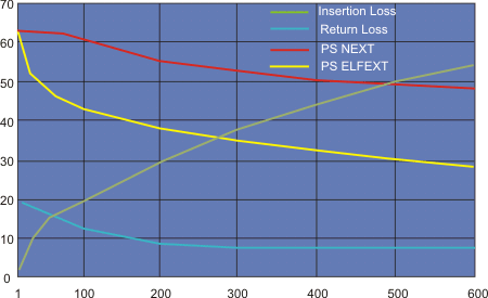 Рис. 3.1.6. Зависимость частотных свойст кабелей класса Е, а также NEXT, FEXT, Return Loss и Insertion Loss от частоты