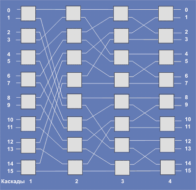 Среди традиционных сетей особое положение занимают сети, базирующиеся на большом числе идентичных ключевых элементов. Это сети с многокаскадными связями (MIN – Multistage Interconnection Network). Идеология таких сетей используется при построении коммутаторов ATM. Из таких сетей наиболее известной является Delta Banyan (Batcher-switch). Эта сеть содержит регулярную структуру N*N переключателей с двух направлений на два. Сеть содержит log2N число каскадов, каждый из которых имеет N/2 переключателей. Для управления маршрутизацией сообщений в этой сети необходимо log2N бит информации. Схема 4-каскадной сети Delta-2 приведена на рис. 4.1.10.1.