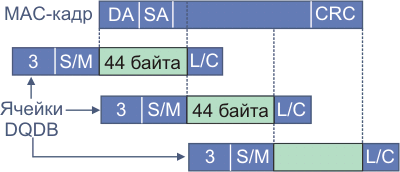 Поле MID остается идентичным для всех DQDB ячеек сегментированного МАС-кадра. Поле ACF содержит биты busy и request, которые используются в рамках механизма qpsx. Бит busy=1 указывает на то, что ячейка занята. Бит request=1 устанавливается узлом, который ждет возможности начать передачу. В каждом узле имеется счетчик запросов RC(request counter), который фиксирует число узлов, ожидающих передачи и стоящих в очереди впереди данного узла. Содержимое счетчика увеличивается всякий раз, когда по шине А проходит контейнер с битом busy=1. Счетчик декрементируется при появлении на шине Б контейнера со свободным битом request. Когда станция сама намеривается передать кадр, содержимое RC переносится в реверсивный счетчик DC, а в регистр RC заносится нуль. Код в DC уменьшается на единицу при получении контейнера с битом busy=1. DC определяет положение запроса в очереди (нуль соответствует началу очереди). Если получен контейнер с request=0 и DC=0, узел может передать ячейку по данной шине. Каждый узел может осуществлять передачу и прием по любой из шин А и Б. В сети DQDB предусмотрено 4 уровня приоритетов и каждый узел поддерживает до 5 очередей с RC и DC счетчиками для каждой из очередей. Для индикации приоритета в поле ACF предусмотрено 4 двоичных разряда (R1, R2, R3 и R4). Высшему приоритету соответствует R4. Схема сегментирования MAC-кадра при передаче с помощью DQDB ячеек показана на рис. 4.1.9.4.