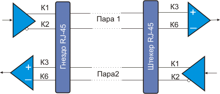 Рис. 4.1.1.1.10. Схеме реализации полно дуплексного канала Ethernet. (Буква К с цифрой отмечает номера ножек контактов разъема)