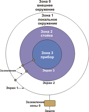 Земли-экраны соседних зон соединяются только в одной точке. Между зонами могут включаться пограничные устройства фильтрации, предназначенные для снижения уровня шумов и помех. В пределах зоны все устройства должны быть эквипотенциальны. Это достигается за счет подключения к общему экрану.