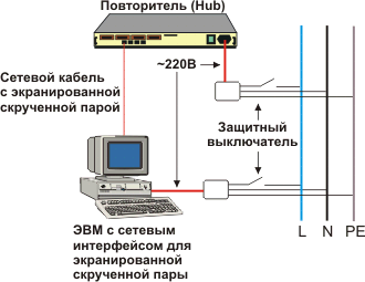 При практической реализации локальной сети обычно возникает проблема защиты и заземления. Если этой проблеме не уделить внимание в самом начале она даст о себе знать позднее и обойдется ее решение дороже. Можно выделить три аспекта. Безопасность персонала, работающего с ЭВМ и сетевым оборудованием, устойчивость к внешним наводкам и помехам, а также безопасность самого сетевого оборудования (противостояние грозовым разрядам или резким скачкам в сети переменного тока (обычно ~220 В)). Безопасность персонала обеспечивается тем, что все объекты, за которые может взяться человек, должны иметь равные потенциалы и в любом случае разница потенциалов не должна превышать 50 вольт. При работе с коаксиальным кабелем существуют рекомендации его заземления в одной точке. Возникает вопрос, что делать с заземлением экранов в случае использования экранированных скрученных пар? Этой проблеме посвящена, например, статья в журнале LANline Special Juli/August 2002 страницы 27-32. Следует сразу заметить, что нужно избегать совмещения применения экранированных и неэкранированных скрученных пар в пределах одной системы. Представляется также естественной и разумной зонная концепция, рассматриваемая в упомянутой статье. На рис. 1. показана схема защиты. Эта схема содержит защитные выключатели на случай грозы или бросков напряжения (линия L). Буквой N обозначена нулевая (нейтральная) шина, а буквами PE - защитная шина.