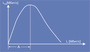 Помимо столкновений в сети может быть зарегистрировано появление ложной несущей (FCE - false carrier event) - битовая последовательность не имеет байта SFD, соответствующего конкретному типу физической среды. Появление ложной несущей обычно связано с состоянием кабеля или шумами. Если фиксируется появление двух ложных несущих подряд, повторитель должен отключить порт (перевести в состояние link unstable) и послать сигнал jam во все остальные порты. Сигнал jam должен продолжаться до конца потока данных, вызвавшего появление ложной несущей. Если канал восстановлен, повторитель переводит порт в нормальное состояние. Отключение порта возможно также при возникновении множественных коллизий (ECE - excessive collision error) - более 60 коллизий подряд. После блокировки порта он будет восстановлен, если в течении 500 тактов коллизии не обнаружены или при повторном включении повторителя. Если рассмотреть зависимость пропускной способности сети L от ее суммарной загрузки Lin, мы для Ethernet получим кривую, показанную на рис. 4.1.1.1.8.