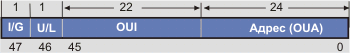 В верхней части рисунка указана длина полей адреса, в нижней - нумерация разрядов. Субполе I/G представляет собой флаг индивидуального или группового адреса. I/G=0 - указывает на то, что адрес является индивидуальным адресом сетевого объекта. I/G=1 характеризует адрес как мультикастинговый, в этом случае дальнейшее разбиение адреса на субполя теряет смысл. Субполе UL является флагом универсального или местного управления (определяет механизм присвоения адреса сетевому интерфейсу). U/L=1 указывает на локальную адресацию (адрес задан не производителем и ответственность за уникальность лежит на администраторе LAN). U/L=I/G=0 характерно для стандартных уникальных адресов, присваиваемых интерфейсу его изготовителем. Субполе OUI (organizationally unique identifier) позволяет определить производителя сетевого интерфейса. Каждому производителю присваивается один или несколько OUI. Размер субполя позволяет идентифицировать около 4 миллионов различных производителей. За корректность присвоения уникального адреса интерфейса (OUA - organizationally unique address) несет ответственность производитель. Двух интерфейсов одного и того же производителя с идентичными номерами не должно существовать. Размер поля позволяет произвести примерно 16 миллионов интерфейсов. Комбинация oui и oua составляют UAA (universally administrated address = IEEE-адрес).