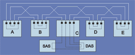 Одной из наиболее популярных сетей, использующих оптическое волокно, (не считая fast ethernet) является FDDI. FDDI (fiber distributed data interface, ISO 9314-1, rfc-1512, -1390, -1329, -1285 - смотри также http://iquest.com/~nmaller/fddi.htm) стандарт американского института стандартов (ansi), принятый без изменения ISO. Протокол рассчитан на физическую скорость передачи информации 100 Мбит/с и предназначен для сетей с суммарной длиной до 100км (40 км для мультимодовых волокон) при расстоянии между узлами 2 км или более. Частота ошибок в сети не превышает 10-9. В FDDI используется схема двойного кольцевого счетчика (рис. 4.1.6.1; буквами a,b,c,d и e обозначены станции-концентраторы). Кольцевая схема единственно возможное решение для оптического волокна (не считая схемы точка-точка). Для доступа к сети используется специальный маркер (развитие протокола IEEE 802.5 - Token Ring). Сети FDDI не имеют себе равных при построении опорных магистралей (backbone) локальных сетей, позволяя реализовать принципиально новые возможности – удаленную обработку изображений и интерактивную графику. Обычно устройства (DAS - dual attached station) подключаются к обоим кольцам одновременно. Пакеты по этим кольцам движутся в противоположных направлениях. В норме только одно кольцо активно (первичное), но при возникновении сбоя (отказ в одном из узлов) активизируется и второе кольцо, что заметно повышает надежность системы, позволяя обойти неисправный участок (схема соединений внутри станций-концентраторов на рис. 4.1.6.1 является сильно упрощенной). Предусмотрена возможность подключения станций и только к одному кольцу (SAS - single attached station), что заметно дешевле. К одному кольцу можно подключить до 500 das и 1000 sas. Сервер и клиент имеют разные типы интерфейсов.