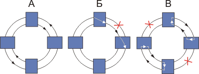 При обрывах оптоволокна возможно частичное (при двух обрывах) или полное (при одном обрыве) восстановление связности сети.