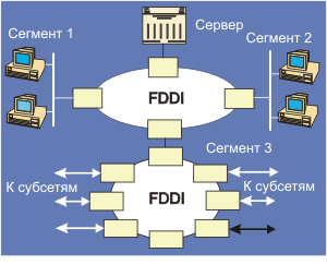 На рис. 4.1.6.7 показан пример использования сети FDDI для доступа нескольких субсетей к общему серверу без взаимного влияния потоков данных. Сегменты 1 и 2 представляют собой субсети Ethernet (10 Мбит/с). Учитывая то, что FDDI имеет пропускную способность 100 Мбит/с, даже при подключении 10 субсетей взаимовлияние их будет практически отсутствовать. Два кольца FDDI, показанные на рис. 4.1.6.7, могут быть объединены друг с другом через мост или маршрутизатор. Сетям FDDI благодаря маркерному доступу не знакомы столкновения в том виде, в каком они существуют в Ethernet и это дает им определенное преимущество перед сетями равного быстродействия, например перед быстрым Ethernet (также 100 МГц). Существует версия FDDI приспособленная для передачи мультимедийной информации. Возможна реализация FDDI на скрученных парах проводов.