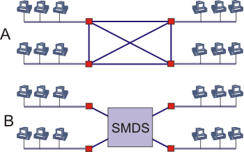 Коммутируемая мультимегабитная информационная служба SMDS (Switched Multimegabit Data Service; RFC-1209, -1694) создана для объединения большого числа локальных сетей. Система была разработана в 80-е годы и реализована в начале 90-х годов. Система SMDS функционирует как высокоскоростная опорная сеть, транспортирующая пакеты от одной локальной сети к другой. SMDS рассчитана на большие краткосрочные всплески трафика. При N локальных сетях, соединенных выделенными каналами, полносвязная схема их соединения требует N(N-1)/2 каналов (см. рис. .1А). Для системы SMDS требуется только N каналов до ближайшего SMDS-маршрутизатора (рис. .1В).