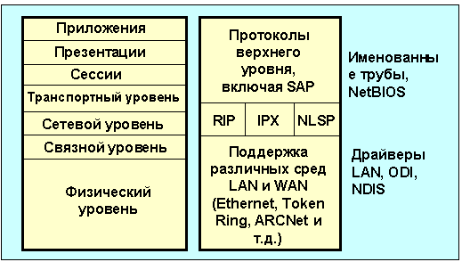 На рис. 4.2.1.4 представлена схема соответствия протоколов Novell и 7-уровневой модели osi.