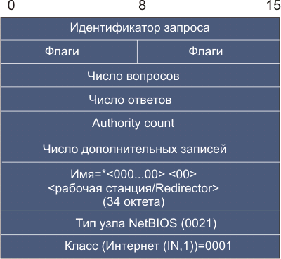 WINS-запросы обычно транспортируются в UDP-дейтограммах. При этом используется порт отправителя=137. В поле данных размешается 2-октетное поле идентификатора, позволяющего связать запрос с откликом. Далее следует 2 байта флагов, в случае запроса туда записывается 0. За ним размещается два октета, содержащие число вопросов, 2 октета числа ответов и еще 4 нулевых октетов. Завершается кадр запроса двумя октетами поля типа (00 21 -> статус узла NetBIOS) и полем класса (для Интернет 00 01 -> (IN,1)). Такие запросы позволяют получить дополнительные данные (имя узла, его MAC-адрес, NetBIOS-имя, имя группы) об ЭВМ с заданным IP-адресом. Причем эта ЭВМ может находиться где угодно в Интернет, но непременно работать в OS Windows. Формат поля данных UDP-дейтограммы запроса показан на рис. 1.