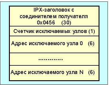 Диагностические запросы содержат код 0x0456 в поле соединителя получателя IPX-заголовка. Формат такого запроса показан на рис. 4.2.1.5.2. Однобайтовое поле счетчика исключаемых узлов задает число станций, которые могут не присылать отклик. Нуль в этом поле предполагает, что все станции должны откликнуться. Допустимый диапазон значений кодов в этом поле 0 - 79. При широковещательной рассылке запроса можно сделать так, чтобы сервер и определенные клиенты на запрос не реагировали. Для этого их адреса помещаются в поля адресов исключаемых узлов. Число таких исключений может достигать 80.
