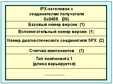 Структура пакета-отклика показана на рис. 4.2.1.5.3. В зависимости от числа компонентов конфигурации пакет-отклик может иметь различную длину. Поля базового и вспомогательного номера версии характеризуют вариант программы diagnostic responder (например, 1.1). Поле номер диагностического соединителя SPX указывает на соединитель, которому отсылаются все диагностические отклики. Поле счетчик компонентов содержит число описаний компонентов, содержащихся в пакете. Поле тип компонента описывает один из компонентов (или процессов) узла, посылающего отклик. Описание компонента может быть простым и расширенным. Простое описание содержит один байт идентификатора компонента. Расширенное описание компонента включает в себя информацию о маршрутизаторах, файл-серверах и невыделенных IPX/SPX. Первое поле в этом случае представляет собой идентификатор расширенного описания, который характеризует тип компонента:
