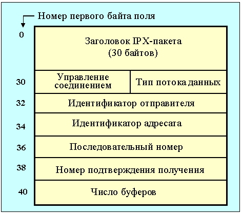 Поля идентификатора отправителя и получателя содержат коды, определяющие участников информационного обмена, присваиваются SPX-драйвером в момент установления связи. В запросах на соединение это поле содержит код 0xffff. Данное поле служит для обеспечения демультиплексирования пакетов, поступающих на один и тот же соединитель (socket). Поле последовательный номер определяет число пакетов пересланных в одном направлении. Каждый из партнеров обмена имеет свой счетчик, который сбрасывается в ноль после достижения 0xffff, после чего счет может продолжаться. Для приложения это поле, также как и последующие два, неприкосновенно. spx-пакеты подтверждения содержат в этом поле порядковый номер последнего посланного пакета. Поле номер подтверждения характеризует последовательный номер следующего пакета, который spx ожидает получить. Любой пакет с порядковым номером меньше, чем задано в поле номера подтверждения, доставлен благополучно и не требует ретрансмиссии. Поле число буферов служит для указания числа доступных на станции буферов (буфера нумеруются, начиная с 0, один буфер способен принять один пакет) и используется для организации управления потоком данных между приложениями. Код этого поля информирует партнера о наибольшем порядковом номере пакета, который может быть послан. Протокол spx посылает пакеты до тех пор, пока локальный последовательный номер не станет равным числу-указателю на удаленной ЭВМ.