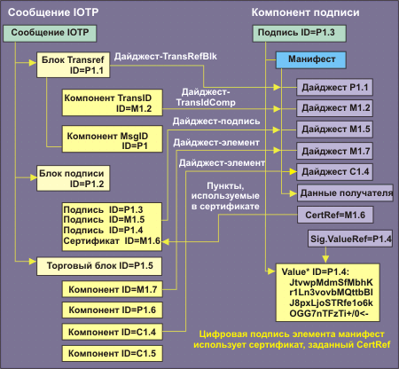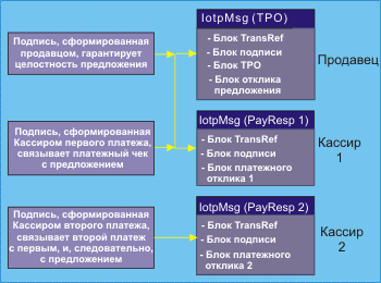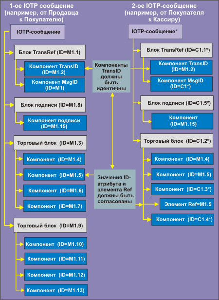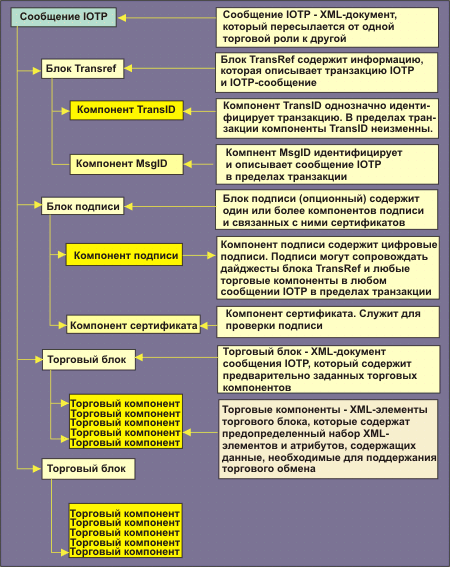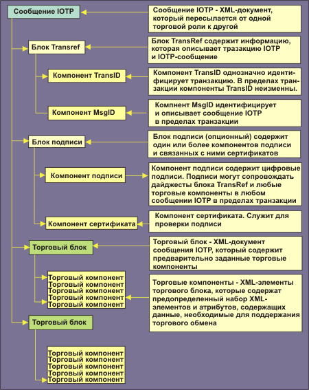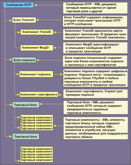 | Сообщение IOTP | Сообщение IOTP является самой внешней структурой, в которую помещаются документы, которыми обмениваются торговые роли, принимающие участие в сделке. Это хорошо сформатированный XML-документ. Документы, которые содержат сообщение, состоят из: o опционный блок Signature, который служит для цифровой подписи торговых блоков или компонентов, связанных с транзакцией IOTP; o опционный блок Error для уведомления о технических ошибках, содержащихся в предыдущем полученном сообщении IOTP и o последовательность торговых блоков IOTP, которые несут данные, необходимые для выполнения транзакции. | |