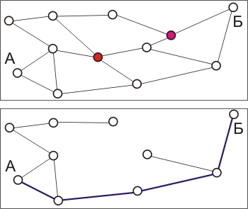 На рис. 4.7 (верх) показан пример сети с двумя узлами, характеризующимися перегрузкой (помечены красным цветом). Предположим, что необходимо проложить виртуальный канал из узла А в узел Б. Из графа маршрутов удаляются перегруженные узлы, после чего осуществляется прокладка пути. В нижней части рисунка синим цветом показан новый виртуальный канал.