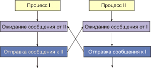 Программирование для сетей существенным образом является программированием для процессов реального времени. Здесь часто можно столкнуться с тем, что одна и та же программа ведет себя по-разному в разных ситуациях. Особое внимание нужно уделять написанию многопроцессных сетевых программ, где также как в случае (см. раздел 7.1; ..\7\sock_71.htm) работы с соединителями могут возникать ситуации блокировок. Пример такой ситуации показан на рис. 4.6.