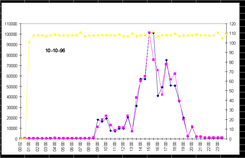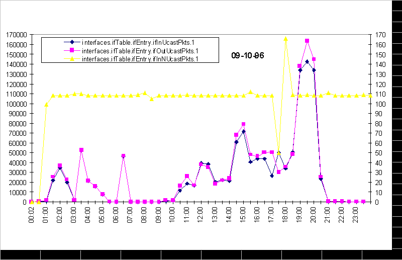 Для защищенных систем доступ к snmp-резиденту в пакетах должно использоваться поле community = паролю. Но даже эта мера не может блокировать вторжение со стороны LAN, так как в результате перехвата snmp-пакетов пароль может быть открыт. При написании таких программ нужно учитывать версии MIB, используемые анализируемыми узлами, а также тот факт, что snmp-отклики могут иметь для разных операционных сред. Рассмотрим, как варьируются некоторые из перечисленных переменных в течении суток и недели. На рис. 4.1.2 видны спады сетевой активности в ночное время и в выходные дни. Левый край диаграммы соответствует понедельнику 9 сентября (ночь), правый - понедельнику, но уже следующей недели. На рис. 4.1.3 приведена диаграмма вариации некоторых переменных за сутки. Сетевая активность захватывает период от 10 часов утра и спадает почти до нуля к 9-10 вечера, хотя бывают и исключения. Для эффективной интерпретации временных зависимостей можно использовать программу мониторинга last (или любой ее эквивалент), которая позволяет отслеживать появление новых пользователей или процессов (например, ftp). Фрагмент распечатки, выданной программой last на ЭВМ, snmp-резидентом которой пользовалась наша программа, приведен ниже.