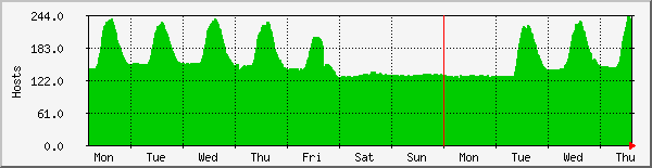 Сходная задача решается на сервере saturn.itep.ru при мониторировании недельных вариаций числа активных ЭВМ в сети. Смотри рис. 5.2.4. На рисунке виден спад числа активных машин в выходные дни (трех-дневная пауза связана с праздником дня России).