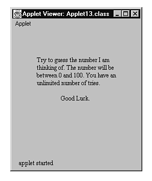 Applet13 is about the simplest applet you can write. All it does is display text. The text comprises instructions for playing a simple number game. If you had to sum up in a couple of words the task performed by Applet13's paint() method, you might come up with something like "Draw Instructions," which is an excellent name for a function to handle that task. Listing 12.2 is a new version of the applet that isolates the instruction-display task in its own function. When you run this applet, it looks identical to Applet13.