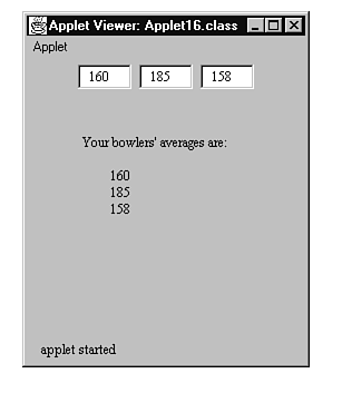 When you run Applet16, you can enter bowling scores into the three boxes at the top of the applet's display area. After you enter these averages, they're displayed on-screen as well as copied into the three variables avg1, avg2, and avg3.