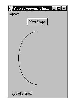 Some shapes you can draw with the Graphics class are more complex than others. For example, the drawArc() method requires six arguments in order to draw a simple curved line. To see how drawing other shapes works, you'll now create the ShapeApplet applet, which enables you to switch from one shape to another in the applet's display. Listing 16.3 is ShapeApplet's source code. Figures 16.6 and 16.7 show what the applet looks like running under the Appletviewer application.