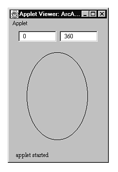 When you run ArcApplet using Appletviewer, you see the window shown in Figure 16.11. (Looks kind of like a guy with shifty eyes and a big nose, doesn't it?) Because the starting angle (in the first text box) is 0 and the drawing degrees (the second box) is 360, the arc is actually a full oval. By changing the values in the two boxes and pressing Enter, you can cause the applet to display different arcs. For example, Figure 16.12 shows an arc that has a starting angle of 120 degrees and drawing degrees of 245.