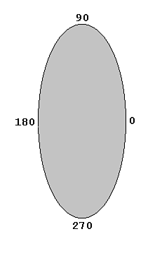 To understand all this angle nonsense, take a look at figure 16.9, which shows how Java relates the arc's starting angle to the degrees of an oval. In the preceding example call to drawArc(), the fifth argument is 90, which means Java starts drawing the arc, within the arc's enclosing rectangle, at the 90-degree point. The sixth argument of 180 tells Java to draw around the arc 180 degrees (or halfway around the full 360 degrees). It doesn't mean that the ending point should be at the 180-degree point. Figure 16.10 shows the resultant arc.
