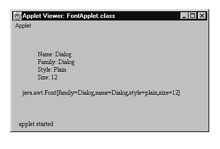 As always, the best way to see how something works is to try it out yourself. With that end in mind, Listing 17.1 is an applet that displays information about the currently active font using many of the methods described in Table 17.1. Listing 17.2 is the HTML document used to run the applet, and Figure 17.2 shows the applet running under Appletviewer.