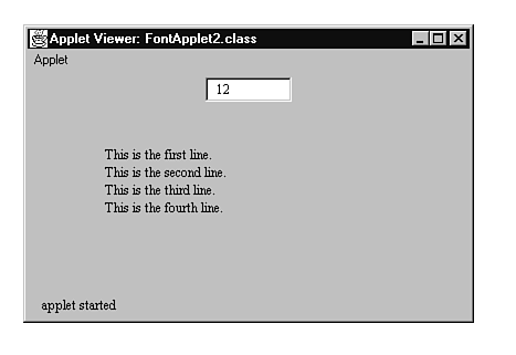 When you run FontApplet2, you see the window shown in Figure 17.5. The size of the active font is shown in the text box at the top of the applet, and a sample of the font appears below the text box. To change the size of the font, type a new value into the text box and press Enter. Figure 17.6, for example, shows the applet displaying 12-point font, whereas Figure 17.7 is the applet displaying 120-point characters. As you can see, no matter what font size you choose, the lines are properly spaced (although large fonts overrun the boundaries of the applet's canvas).