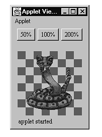 You're now ready to write an applet that can display images. Listing 27.1 is the Java source code for an applet called ImageApplet that displays a small image using the techniques described previously in this chapter. When you run the applet with Appletviewer, you see the window shown in Figure 27.1. Make sure the SNAKE.gif image is in the same directory as the ImageApplet.class file, since that's where the program expects to find it.