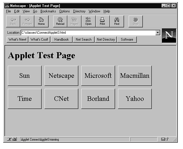 The ConnectApplet2 applet, shown in Listing 28.5, is just such an applet. In its current version, it provides four buttons that give you instant connection to the Web sites represented by the buttons. Want to jump to Microsoft's Web page? Give the Microsoft button a click. Want to check out the latest news at Macmillan Computer Publishing? Click the Macmillan button. Of course, just as with the original ConnectApplet, you must have your Internet connection established before you run the applet. And, you must run the applet from a Java-compatible browser.