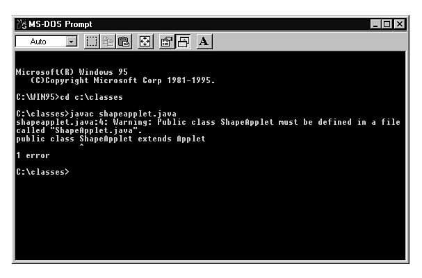 There are a couple of important things to remember about this command. First, the Java compiler is case-sensitive when it comes to comparing source-code file names with the names of the class contained in the file. For example, if your source-code file is named shapeapplet.java and the class it defines is ShapeApplet, the Java compiler will complain and not compile the file (Figure 34.2).