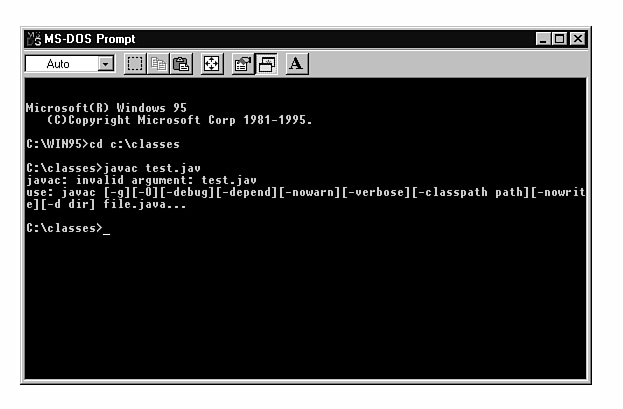 Suppose you have your Java source code files (the ones with the .java extension) in a folder called C:\CLASSES, as you have for the applets you've created in this book. Now you want to have the .CLASS files that are created by the Java compiler placed in a subdirectory of CLASSES called COMPILED. You'd first create the subdirectory with the command md compiled. Then you'd issue the following command: