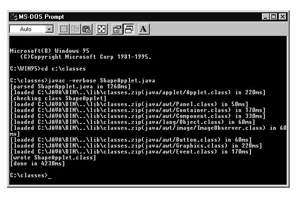 To test the -g option, copy the ShapeApplet.java file from the CHAP34 folder on this book's CD-ROM to your CLASSES directory. Then, compile the file with the following command: