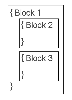 In the figure, Block 1 encloses both Block 2 and Block 3. That is, Block 2 and Block 3 are nested within Block 1, because these blocks occur after Block 1's opening brace but before Block 1's closing brace. If you wanted, you could also create a Block 4 and nest it within Block 2 or Block 3, and thus create even another level of nesting. As you'll see when you start writing full-length Java programming, all programs have a lot of nesting going on.