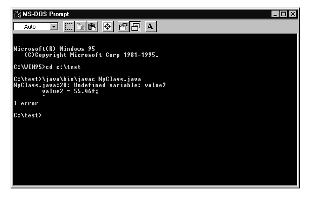 The second variable in the program, value2, is defined inside the Block2 block, where it's both declared and assigned the value 4.5f. In the Block3 block, the program tries to assign a value to value2. If you tried to compile this program, you'd see that this line creates an error message, as shown in Figure 5.2. In the figure, the compiler is insisting that value2 in the Block3 block is undefined, which, of course, is true as far as the Block3 block is concerned. You'd get a similar message if you tried to access value2 anywhere but within the scope of the Block2 block.