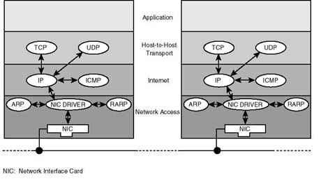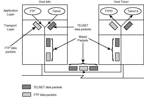 TCP/IP Protocol ArchitectureThe TCP/IP communications suite was designed with modularity in mind. This means that instead of developing a solution which integrates all aspects of communications in one single piece of code, the designers wisely chose to break the puzzle into its constituent components and deal with them individually while recognizing the interdependence tying the pieces together. Thus, TCP/IP evolved into a suite of protocols specifying interdependent solutions to the different pieces of the communications puzzle. This approach to problem solving is normally referred to as the layering approach. Consequently, hereafter, reference will be made to the TCP/IP suite as a layered suite of communications. Figure 20.1 shows the four-layer model of the TCP/IP communications architecture. As shown in the diagram, the model is based on an understanding of data communications that involves four sets of interdependent processes: application representative processes, host representative processes, network representative processes, and media access and delivery representative process. Each set of processes takes care of the needs of entities it represents whenever an application engages in the exchange of data with its counterpart on the network. These process sets are grouped into the following four layers: application layer, host-to-host (also known as transport) layer, internet layer, and network access layer. Each of these layers may be implemented in separate, yet interdependent, pieces of software code. Figure 20.1. Application Layer Application representative processes take care of reconciling differences in the data syntax between the platforms on which the communicating applications are running. Communicating with an IBM mainframe, for example, might involve character translation between the EBCDIC and ASCII character sets. While performing the translation task the application layer (for instance, application representative process) need not have (and shouldn't care to have) any understanding of how the underlying protocols (for instance, at the host-to-host layer) handles the transmission of translated characters between hosts. Examples of protocols supported at the application layer include FTP, TELNET, NFS, and DNS. Host-to-Host Transport Layer Host representative processes (for example, the host-to-host, or transport, layer) take care of communicating data reliably between applications running on hosts across the network. It is the responsibility of the host representative process to guarantee the reliability and integrity of the data being exchanged, without confusing the identities of the communication applications. For this reason the host-to-host layer is provided with the mechanism necessary to allow it to make the distinction between the applications on whose behalf it is making data deliveries. In other words, assume that two hosts, tenor and alto, are connected to the same network, as shown in Figure 20.2. Furthermore, assume that a user on host alto is logged in to FTP on host tenor. Also, while using FTP to transfer files, the user is utilizing TELNET to login in to host tenor to edit a document. In this scenario, data exchanged between both hosts could be due to TELNET, FTP, or both. It is the responsibility of the host-to-host layer, hereafter called the transport layer, to make sure that data is sent and delivered to its intended party. What originates from FTP at either end of the connection should be delivered to FTP at the other end. Likewise, TELNET-generated traffic should be delivered to TELNET at the other end, not to FTP. To achieve this, as will be discussed later, the transport layer at both ends of the connection must cooperate in clearly marking data packets so that the nature of the communicating applications is easily identifiable. Protocols operating at the transport layer include both UDP (User Datagram Protocol) and TCP (Transmission Control Protocol). Later sections will cover the characteristics of both protocols. Figure 20.2. Internet Layer The internet layer is responsible for determining the best route that data packets should follow to reach their destination. If the destination host is attached to the same network, data is delivered directly to that host by the network access layer; otherwise, if the host belongs to some other network, the internet layer employs a routing process for discovering the route to that host. Once the route is discovered, data is delivered through intermediate devices, called routers, to its destination. Routers are special devices with connections to two or more networks. Every router contains an implementation of TCP/IP up to and including the internet layer. As shown in Figure 20.3, hosts alto and tenor belong to different networks. The intervening networks are connected via devices called routers. For host alto to deliver data to host tenor, it has to send its data to router R1 first. Router R1 delivers to R2 and so on until the data packet makes it to host tenor. The "passing-the-buck" process is known as routing and is responsible for delivering data to its ultimate destination. Each of the involved routers is responsible for assisting in the delivery process, including identifying the next router to deliver to in the direction of the desired destination. The protocols that operate at the internet layer include IP (Internet Protocol), and RIP (Route Information Protocol) among others. Figure 20.3. Network Access Layer The network access layer is where media access and transmission mechanisms take place. At this layer, both the hardware and the software drivers are implemented. The protocols at this layer provide the means for the system to deliver data to other devices on a directly attached network. This is the only layer that is aware of the physical characteristics of the underlying network, including rules of access, data frame (name of a unit of data at this layer) structure, and addressing. While t
