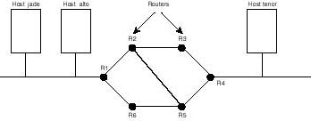 Every printed set of three asterisks shown above is an indication of traceroute's failure to make it across a router. Accordingly, this traceroute command failed to go anywhere beyond the second router that it encountered on the network, independent of the value of TTL (printed in the first column) at the time the attempt was made. traceroute exits when the TTL field increments to 30. ripquery troubleshooting routing problems often requires verifying the validity of the routing tables as they exist on some of the routers intervening between the source and destination hosts including the hosts themselves. On the local host this is normally done using the netstat -rn command (explained earlier in the chapter). Verifying routing tables on remote hosts and intervening routers (whether the routers are specialized routing devices or full fledged multihomed UNIX hosts) may not be as convenient. Verifying routing tables on remote hosts requires logging in to them before being able to invoke the netstat command. Using ripquery, you can query, from the local workstation, remote hosts for their routing tables. When issued, ripquery polls the target host for its routing table and displays it on the local workstation's screen. To perform a successful poll, ripquery requires that the routing daemon such as routed be running on the host being queried. Otherwise ripquery times out and exits silently. The following example demonstrates the use of ripquery to poll host jade for its routing table: # ripquery jade