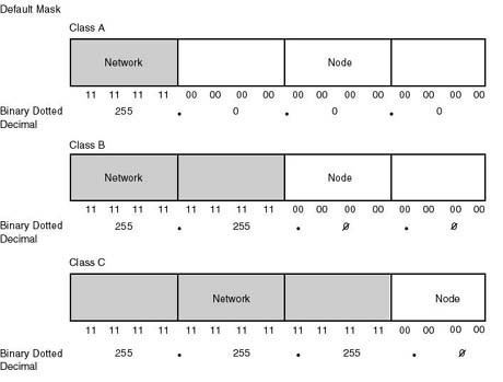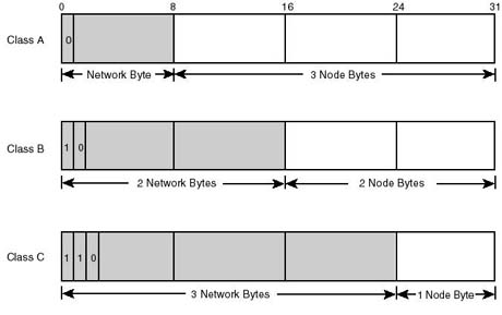 You can invoke ICMP by using the UNIX ping command to check on the reachability of a remote host as shown here: # ping 123.5.9.16 123.5.9.16 is alive ping invokes an ICMP echo request message that is sent to the designated host. If, upon receiving the echo request, the host responds with an ICMP echo response message, it is reported as being alive (as shown in the example), and hence, reachable. Otherwise, the host is deemed not reachable. IP Address Structure In TCP/IP, every device on the network derives its unique complete network address by virtue of an address assignment to which the device is configured (more on configuration later in the chapter). The reason the address is termed complete is because it is pretty much all that is needed to locate it on the network regardless of its size (similar to the postal address, which completely describes your home address--thus helping others to unambiguously locate you). The assigned address is known as a symbolic IP address, and is made up of two parts: 1) the network address, which is common to all hosts and devices on the same physical network, and 2) the node address, which is unique to the host on that network. As you will see, neither part has anything to do with the actual hardwired MAC address on the network address card. As a matter of fact, a network administrator has the freedom to change the node part of the address (with some restrictions), and to a lesser degree the network address, irrespective of the MAC address. For this reason, the address is described as symbolic. Confusing as it may initially sound, the IP protocol uses these symbolic addresses to route data on the network. In other words, when a user requests that a telnet session be established with another host, TCP/IP uses the administrator assigned 32-bit IP addresses in order to connect and establish the telnet session between both the requesting and the target hosts. The details of this are going to be tackled later in the chapter (refer to the "Address Resolution Protocol" section. First, have a look at how IP addresses are made, and the classes to which they belong. The IP address is 32 bits (or four bytes) long, including both the network and the node addresses, and it occupies the IP source and destination address fields of the IP header. How many bits of the address belong to the network part, versus the number of bits that belong to the node part is dependent on the IP address class into which the address falls. IP defines three main classes: A, B, and C. There is a class D, which is lesser in significance than the other ones and will be touched on very briefly. Figure 20.10 shows the different address formats corresponding to each of the three main classes that IP supports. Each IP address class is distinguishable by the very first few bits of the network portion. The following is a listing of the different IP classes and the rules by which they are governed: Figure 20.10. Class A address: The first bit is fixed to 0, and the first byte is called the network id and identifies the network. The remaining three bytes are used to identify the host on the network, and comprise the host id. It can be calculated that there is a maximum of 127 class A networks, with each capable of accommodating millions of hosts. Class B address: The first two bits are fixed to 10, the first and second byte are used to identify the network, and the last two bytes are used to identify the host. There can be 65,535 hosts on class B networks, capable of accommodating thousands of hosts. Class C address: The first three bits are fixed to 110, the first, second, and third bytes are used to identify the network, and the last byte is used to identify the host. Class C networks are the smallest of all classes, as each can accommodate a maximum of 254 hosts (not 256, because 0x0 and 0xFF are reserved for other purposes). With three bytes reserved to identify the network, millions of class C networks can be defined. Class D address: The first four bits are fixed to 1110. A class D address is a multicast address, identifying a group of computers that may be running a distributed application on the network. As such, class D does not describe a network of hosts on the wire. To make address administration a relatively easy task, TCP/IP network administrators can configure hosts, and routers, with addresses by using what is commonly known as dotted decimal notation. Dotted decimal notation treats the 32-bit address as four separate, yet contiguous, bytes. Each byte is represented by its decimal equivalent, which lies between 0 and 255 (the decimal range equivalent to an 8-bit binary pattern). Figure 20.11 shows an example of a class A address in both binary and dotted decimal (69.18.11.135) notation. Figure 20.11. Given that an 8-bit binary pattern can assume any decimal equivalent in the range of 0 to 255 and given the initial bits of a certain class, you should be able to tell from the first byte the class of the network. Table 20.1 below depicts the range of values for the first byte of each of the IP address that classes can assume. Table 20.1. IP address classes and the range of values their respective first byte can assume.
