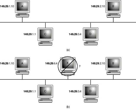 Consider the address 148.29.4.121. By applying the rules learned above, it can be determined that this is a class B address, since the first byte lies in the 128 to 191 range of values. And since a class B address has the first two bytes for a network address, it can be derived that the network address is 148.29 while the host address is 4.121 on that network. To generalize, given an IP address, its class can be recognized by interpreting the first byte. Consequently, the network portion of the address can be derived from the remaining bytes. Figure 20.12 shows an example of a class B network. Notice how all the hosts have the 148.29 network address in common. A host misconfigured (for example, host X in Figure 4.4b) to any other network address will not be able to talk to other hosts on the network, be it on same physical network or other router connected networks. When a host or any other network device is assigned an IP address, IP derives its network class and network address from that assignment (148.29). Later, when it is required to deliver a datagram to a host, it compares the network address of the destination address submitted by the transport protocol (TCP or UDP) to that of its own. If the addresses match, IP refrains from routing the datagram (as explained earlier, the datagram won't be sent to a router for assistance in delivery). Instead, IP assumes that the host is on the same network and, therefore, attempts a direct delivery to the designated node address. Figure 20.12. Assuming that you are on host X and want to establish a file transfer session with host A on the network, you can enter the command: ftp 148.29.1.10 Refer to the "Domain Name System" section later in this chapter to learn how to specify a host using a name instead of the IP address. TCP picks up the address and passes it to IP, at the Internet layer, along with a TCP segment (which in turn contains the user request for FTP connection) that it wants delivered to host A. IP, on host X, compares its own network address (147.29) with that of host A (148.29). Since they are not the same, IP concludes that host A must belong to a remote network, and therefore direct delivery is not possible. For simplicity, assume that the network in Figure 20.4b is the only one in its environment, in which case there can be no routers on the wire. IP won't be able to forward the packet any further and will report a failure to deliver to the upper layer or application. In Figure 20.13 you are shown two networks, a class B Ethernet network and a Token-ring class A network. A router is also shown connecting the two networks. An important observation to make is that the router is configured to two addresses, 148.29.15.1 and 198.53.2.8. The question that normally arises is, which of the two is the address? Well, as a matter of fact an address which you assign to the host is assigned to, or associated with, the network interface card that attaches the host to the network. Hence, in the case of a router and multihomed host, an address is required for every NIC card supported. Depending on which network the NIC attaches the host to, it must be assigned an IP address with a network part consistent with the network address assigned to the rest of the hosts community. Hosts on the Token-ring network use 198.53.2.8 to address the router, whereas those on Ethernet use 148.29.15.1. Figure 20.13. You saw earlier that all 0s and all 1s (0x0 and 0xff, respectively) are reserved for special purposes, and therefore cannot be used to designate a node on the network. This is because an all 0s node address refers to all nodes on the network. For example, in the routing table of the router in Figure 20.13, a destination address of 198.53.2.0 refers to all hosts on the Token-ring network . While an all 1s node address is normally used to broadcast a message to all hosts on that network. Therefore, a host transmitting a broadcast message to 198.53.2.255 will have the message picked up by all active hosts on the Token-ring network only. Similarly, a broadcast to 148.29.255.255 will be picked up by all hosts on the Ethernet. In addition to the reservations made on the node addresses described above, there are two class A network addresses that bear a special significance and cannot be used to designate a network. They are network addresses 0 and 127. Network 0 is used to designate the default route, whereas 127 is used to designate this host or the loopback address. As explained previously (refer to the "Data Routing" section) in this chapter, the default route refers to a router configuration that makes the routing of packets to destinations that are unknown to the router possible. The loopback address is used to designate the localhost and is used to send to the interface an IP datagram in exactly the same way other interfaces on the network are addressed. Conventionally, 127.0.0.1 is the address which is used to designate the local host. You can, however, use any other class A 127 address for the same purpose. For example 127.45.20.89 is valid for designating the local host as is the 127.0.0.1. This is because a datagram sent to the loopback interface must not, in any case, be transmitted on the wire. Subnet Mask Class B networks accommodate approximately 65,000 hosts each, whereas Class A networks accommodate thousands of nodes. In practice, however, it is not feasible to put all on the same network. Here are two considerations: