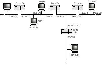 For example, host trumpet's routing table (see Figure 20.16) would include an entry saying that it is 2 hops (the distance or metric) or routers away from network 148.67.0.0, and that the next router to deliver to is at address 100.0.0.2. Router R2's routing table entry would say that it is one router away from the same destination network (148.67.0.0), and that the next router to send the data to is R3. The UNIX command to display the contents of the routing information table is netstat -rn as shown here: # netstat -rn Routing tables Destination Gateway Flags Refs Use Interface 127.0.0.1 127.0.0.1 UH 1 0 lo0 87.45.3.4 198.53.237.20 UGH 0 0 e3B0 100 100.0.0.2 U 4 51 wdn0 221.78.39 198.53.237.20 UG 0 0 e3B0 default 198.53.237.5 UG 0 0 e3B0 198.53.237 198.53.237.1 U 3 624 e3B0 Here is how to interpret each of the preceding columns: