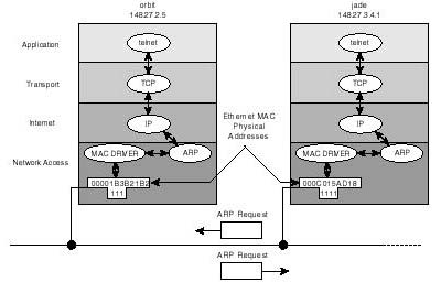 Route Table Maintenance TCP/IP supports both static and dynamic means of maintaining the routing table. Static means of maintaining the routing table mainly involve the use of the two UNIX commands: ifconfig and route add. Using ifconfig, a network interface card can be configured to an IP address and the applicable subnet mask as shown in the following example: # ifconfig e3B0 100.0.0.2 255.0.0.0 Aside from configuring the interface (e3B0) to the specified address and subnet mask, the ifconfig command has the effect of updating the route information table with a static route information pertaining to the directly attached network (i.e. 100.0.0.0) as shown in the previous listing of the output of netstat -rn command. Using the route add command a static route can be entered to the routing table of a UNIX host. The syntax of the route command is: route add destination_address next_router metric in which destination_address is the route you want to add to the routing table. next_router is the address of the next router to forward the datagrams to. metric is a measure of distance to the destination, normally expressed in number of intervening routers. The following example shows how route add can be used to add a new destination to the routing table: # route add 87.45.3.4 198.53.237.20 1 The following example shows how to use route add to configure a host for the default route entry: # route add 0.0.0.0 198.53.237.5 1 By virtue of the preceding entry, the host in question is being configured to recognize the router at address 198.53.237.5 as being its default gateway. Dynamic route maintenance involves the automatic addition of new discovered routes to the route table. It also involves deletions of routes that are no longer valid by virtue of network reconfiguration or due to failures. There are several protocols that might be employed for the task of dynamic route maintenance. Among the currently common ones are Route Information Protocol (RIP), Open Shortest Path First (OSPF), and Internet Control Messaging Protocol (ICMP). Of the three only ICMP was briefly discussed earlier in the chapter. For detailed treatment of all routing information protocols the reader is referred to the section "Networking". Address Resolution Protocol (ARP) Every network interface card is guaranteed to have a unique 48-bit address hardwired to the card itself. This address is commonly referred to as Medium Access Layer (MAC) address. The IP address you assign to a host is independent of the MAC address which is hardwired on the network interface card in that host. As such, every host ends up maintaining two addresses, the IP address which is significant to TCP/IP protocols only, and the MAC address which is significant to the network access layer only. Data frames exchanged on the wire however, rely on the latter address, which indicates that there must be some sort of binding relation between these two forms of addresses. This section unravels this relationship. In particular, you will be shown how, given the IP address of a target host, the network access layer finds the corresponding MAC address, used later by the MAC protocol (e.g. Ethernet) to communicate data frames. Figure 20.17 includes a depiction of the events which take place between two hosts when they try to talk to each other. In the diagram, both the IP address and the MAC layer addresses are shown for both hosts. It is assumed that a user on host jade wanted to establish a TELNET session with host orbit. The following is what happens: Figure 20.17.