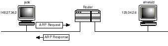 ARP Cache When an IP address is resolved to its equivalent MAC address, ARP maintains the mapping in its own special ARP cache memory, improving transmission efficiency and the response time to user requests. Another benefit of ARP caching is the bandwidth saving realized by not requiring that a host sends an ARP request broadcast every time it has data to send to the same target host. ARP cache can be checked using the arp command as shown in the following. $ arp -a jade <100.0.0.10> at 0:0:1b:3b:21:b2 How long ARP maintains an entry in its cache table is a function of how often the host communicates with a specific host, and vendor implementation. Proxy ARP Proxy ARP is an implementation of ARP at the router which is designed to handle ARP queries on behalf of hosts on remote networks. Looking at Figure 4.10, with proxy ARP on the router, then whenever jade sends out an ARP query requesting the MAC address corresponding to IP address 129.34.2.6, the following events take place: Figure 4.18.