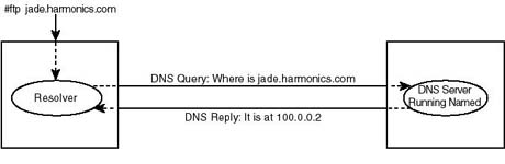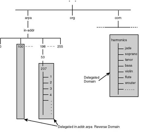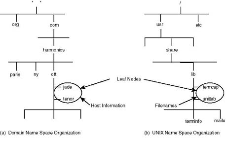 As shown, each entry consists of an IP address, the host name associated with the IP address, and, optionally, an alias, where an alias is another name for the same host in question. For example, jade and jade.harmonics.com refer to the same host (that of IP address 100.0.0.2). For a user to establish a telnet session with jade, he has the choice now of entering: $ telnet jade or $ telnet jade.harmonics.com All TCP/IP applications, such as telnet and ftp, have a built-in name resolution mechanism that looks at the host's table and returns the corresponding IP address to the invoked application. The application then proceeds to contacting the corresponding host across the network. Failure to resolve the name to an IP address normally results in the error message "Unknown host". Domain Name System The host's table-based approach to name resolution is convenient for reasonably small networks with few entries to include in the /etc/hosts file, provided that these networks are not connected to the Internet and have no need to run DNS services. Even if the network is not connected to the Internet, the idea of maintaining identical /etc/hosts files on all UNIX hosts is a time-demanding idea as it requires that changes made to one must be consistently implemented in all others. An approach that can easily become nightmarish as the size of the network increases. Domain Name System (DNS, RFC 1035) is an alternative way to performing name resolution. Using DNS to resolve host names to IP addresses involves the use of a global, hierarchical and distributed database containing information (including IP addresses) about all hosts on the network as well as those on the Internet. The hierarchy allows for the subdivision of the name space into independently manageable partitions called domains (or subdomains). The distributed nature allows for the relocation of partitions (subdomains) of the database onto name servers belonging to sites around the network or the Internet. Consequently, sites hosting name services can be delegated the responsibility for managing their subdomains. A name server is a host maintaining a partition of the DNS database and running a server process (on UNIX it is called named daemon) that handles name-to-IP address resolution in addition to providing some other pertinent host information. TCP/IP applications have the DNS client component, known as the name resolver, built into them. In other words, no special UNIX daemon is required to support name queries on behalf of applications. Figure 20.21 shows how a name query is handled as a user enters the ftp jade.harmonics.com to start a file transfer session. Host name jade.harmonics.com is the fully qualified domain name (FQDN) by DNS naming rules, which will be shortly discussed. According to the diagram, resolver routines, included in the ftp client, package the name in a DNS query and send it to a DNS server that the host is configured to recognize. The DNS server looks up the requested information (in the case, the IP address) and sends a reply to the requesting host. Figure 20.21. Logical Organization of DNS When setting up DNS, you ought to follow certain rules in organizing your domain. Understanding those rules is as important to the proper implementation of DNS as understanding the rules which govern file system organization for the effective administration of you UNIX system. The Internet's DNS organization will be used throughout the chapter to illustrate DNS concepts. Also, a fictitious subdomain (harmonics.com) will be introduced to illustrate some of the associated concepts at this level. It is important that you keep in mind that your situation may dictate a different organization from the Internet's. The rules and concepts, however, are still the same. DNS is a hierarchical database of host information. Its structure resembles, to a great extent, that of computer file systems. Figure 20.22 draws an analogy between the organization of DNS and that of the UNIX file system. In both cases, the organization follows that of an inverted tree with the root at the top of the structure. Where the root of the file system is written as a slash "/", that of DNS is written as a dot "." representing the null "" character. Below the root level, the upper most domain is defined and may be subdivided into domains, which can then be further divided into subdomains--similar to dividing the UNIX file system into subdivisions called directories and subdirectories. Each subdomain is assigned a name (or a label), which can be up to 63 characters long, and can be divided further into subdomains. DNS allows nesting of up to 127 domains in one tree. Figure 20.22. Each domain (or subdomain) represents a partition of the database, which may contain information about hosts in that domain, and/or information about lower domains (using the file system analogy, a directory or subdirectory represents a partition of the file system where information about both files and lower subdirectories is kept). A directory, or file, under the UNIX file system, can be referred to using relative paths or an absolute path specified relative to the root. The lib directory in Figure 20.22b can be referenced relative to its parent share directory, or relative to the root "/", to become /usr/share/lib. In a similar fashion, a domain under DNS can be referred to relative to its parent domain using its name only, or relative to the root domain. A domain name specification relative to the root is known as fully qualified domain name (FQDN). As Figure 20.23 illustrates, an absolute file or directory name is written as a sequence of relative names from the root to the target directory, or filename. Under DNS, a fully qualified domain name is written as a sequence of labels, starting with the target domain name and ending at to the root domain. For example, ott.harmonics.com is the fully qualified domain name of the subdomain ott. Figure 20.23. To translate these into real 
