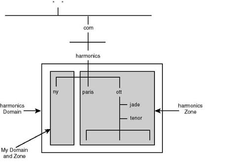 An example of an educational organization is Purdue University, which on the Internet is known as purdue.edu, whereas ibm.com represents IBM's commercial domain. Most of the organizations joining the top level domains are located in the U.S. This is due to the fact that the Internet started as an experiment led by a U.S. agency (ARPA), in which only U.S. organizations participated. As the Internet success and popularity crossed national boundaries to become an international data highway, the top level domains were reorganized to include domain labels corresponding to individual countries. Country domain labels followed the existing ISO 3166 standard which establishes an official, two-letter code for every country in the world. In Figure 20.25, labels such as ca and tn designate Canada and Tunisia. The U.S. also has its country domain label (us) to which organizations may choose to belong instead of belonging to any of the more traditional domains. The arpa domain (see Table 20.2) is a very special domain used by DNS name servers to reverse resolve IP addresses into their corresponding domain names. Domains and Zones You learned earlier that once the authority for a subdomain is delegated to an organization, that organization may subdivide its domain into lower level subdomains. Subdividing a domain should not necessarily lead to delegating every subdomain's autonomy to other member departments in the organization. So although a domain is partitioned into many lower-level domains, authority over the domain can be aligned along zone boundaries, in which case a zone may contain a subset of the domains that the parent domain contains. Figure 20.26 illustrates the difference between a domain and a zone. As show in the figure, harmonics domain contains the ott, ny, and paris subdomains. Yet, only two zones of authority are established: the harmonics zone which includes both ott and paris subdomains, and the ny zone including to the ny domain. When setting up name servers, you will be assigning zones of authority--you will be configuring them to maintain complete information about the zone for which they are said to have authority. You can, if you wish, make a name server authoritative for more than one zone. Figure 20.26. Authority for the harmonics domain is reduced to two zones: the harmonics zone, which contains information about both ott and paris subdomains, and the ny zone, which contains information about the ny domain only. Name Servers Setting up DNS services to support the domain or zone for which an organization is delegated authority involves creating a set of authoritative servers for that zone. At a minimum, two servers a primary and secondary should be setup. The primary name server is where the database files are being maintained and is the most time consuming to setup. Changes made to the DNS whether to the layout or structure of the domain being delegated or simple updates to the database must be administered and reflected on the primary name server. For example, to add a new host to the network, you have to assign it both a name and an IP address, and you must enter those assignments in the DNS database contained on the primary server. The secondary name server is easier to set up than the primary. It is different from the primary in that it derives its database from the primary's by virtue of replicating it through a process known as zonal transfer. Once set up, the secondary requires very little maintenance. Every time the secondary server is rebooted, it undergoes the zonal transfer process by contacting the primary server for the zone for which they both are responsible, and requesting all the information pertaining to that zone. Thereafter, the secondary server routinely polls the primary server for any updates that might have been made to the database. As will be shown under the section "Implementing DNS," a secondary server can be easily configured to backup the zone data after transfer to disk files. This option allows the secondary server to reload its data using the backup files instead of undergoing zonal transfer every time the server is restarted--resulting in reduction in bandwidth consumption due to zonal transfers, and the better availability of data in case the secondary fails to hear for the primary when the transfer is initiated. It is not absolutely necessary to install any other than the primary server in order to bring up the DNS service. Including a secondary server has, however, the following advantages: